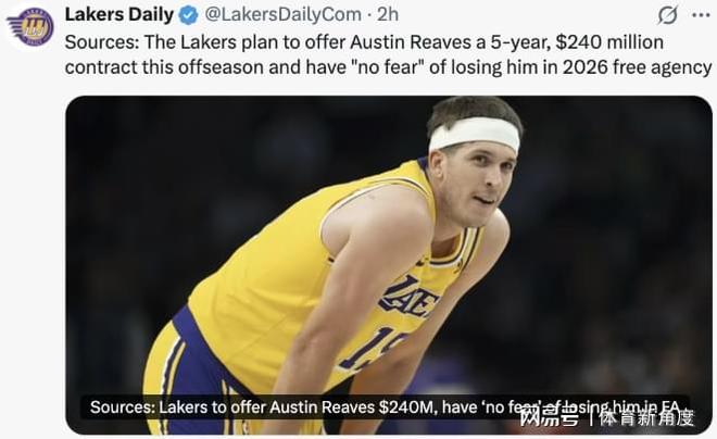 今日,《湖人日报》刊载了一篇题为《消息人士透露,湖人计划在今年休赛期为奥斯汀·里夫斯提供一份5年2.4亿美元的合同,且“无惧”其于2026年自由球员市场离队风险》的文章,具体内容如下: